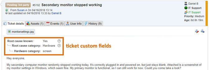 In the example below, agent Daniel used custom fields to mark the ticket that was assigned to him as a hardware related issue.