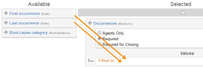 In the example below, the First occurrence and Last occurrence fields will become available when the Occurrences field is filled in, the Root cause category field will become available when the Root cause known field is set to Yes.