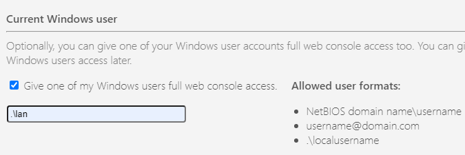 Optionally, you can also give one of your Windows accounts or a local account full access to the web console. Access to other accounts can be provided later.