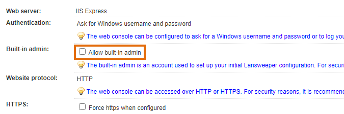 After configuring these accounts, you can complete the First Run Wizard, and you will be logged in automatically to complete the configuration of Lansweeper. With the next logon, you need to use either the built-in admin or the configured Windows account to get access. Leaving the built-in account activated will put your Lansweeper web console at risk. As long as the account remains enabled, a notification will be shown in the web console.