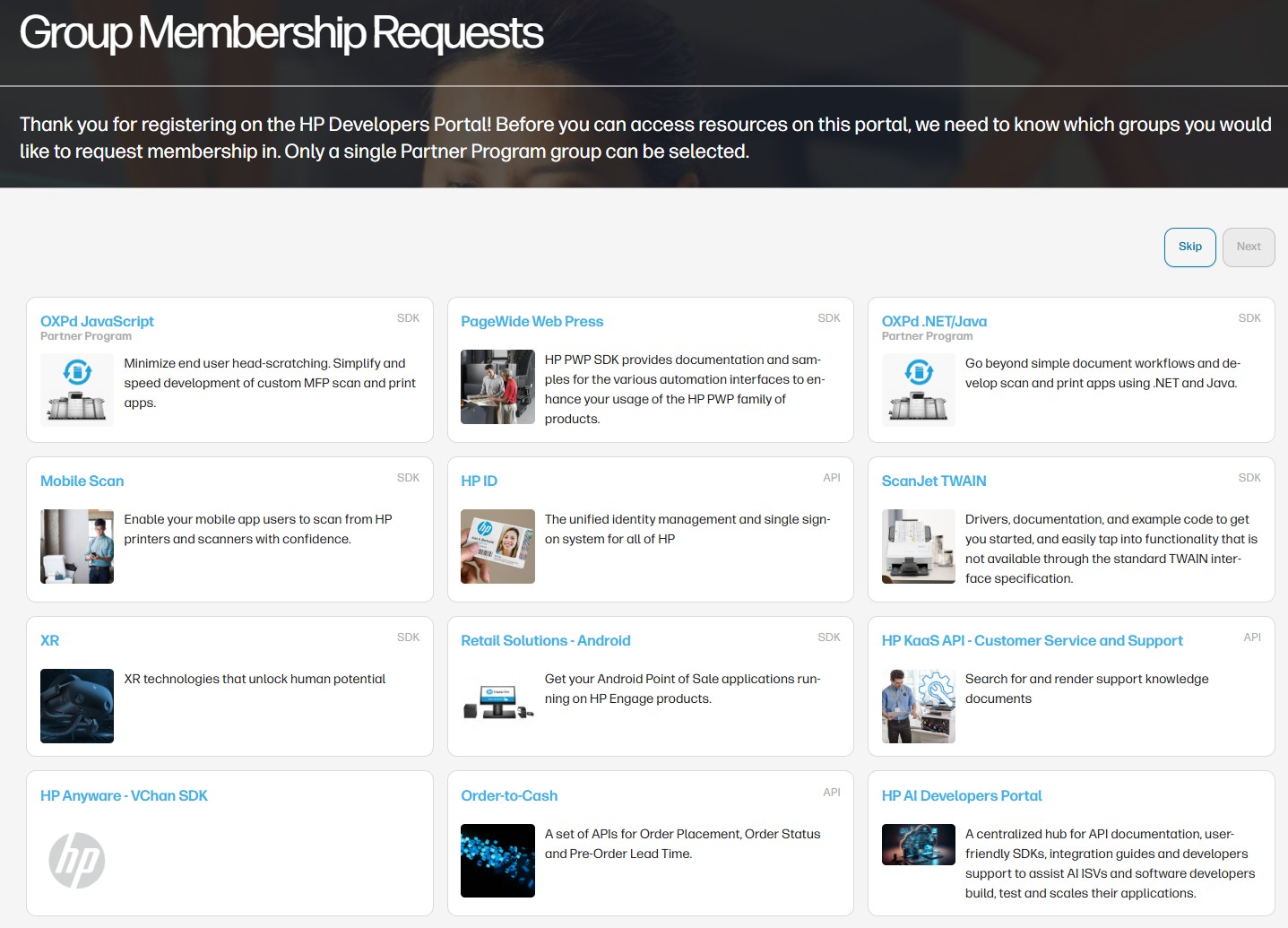 None of the groups listed on HP's site indicates it will provide access to the Warranty API so if you skip the initial group selection page you can then see some more options including HP Client Management (which does mention Warranty tracking), but this then goes to a placeholder page with no further info. The other possible option is HP Proactive Insights but this then requires another login which indicates you need to be a paying customer to access anything further.