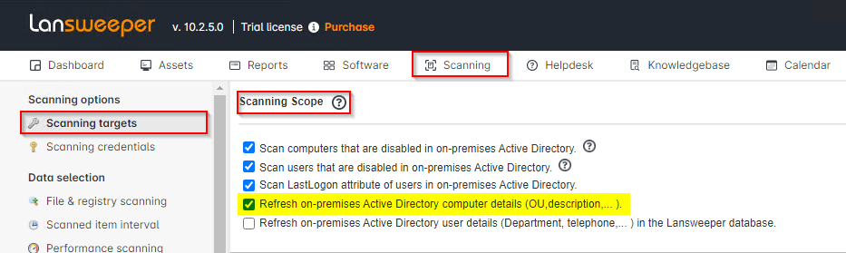 Ensure that you are refreshing this information, by checking the Refresh on-premises Active Directory computer details (OU,description,... ) option, which can be found under Scanning/Scanning Targets in the Scanning Scope section.