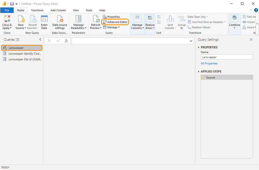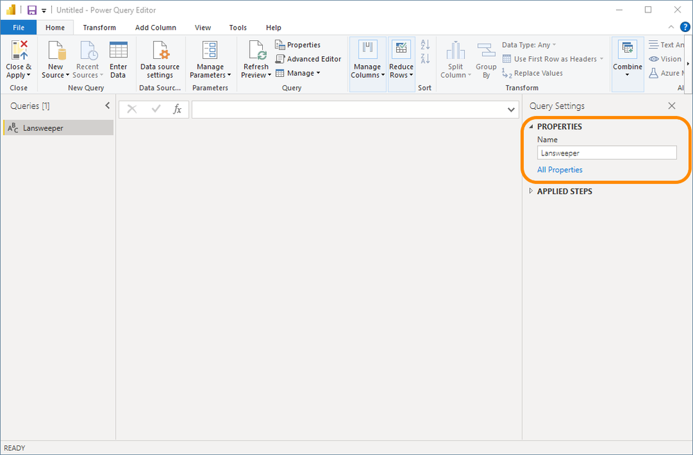 - A PROPERTIES section is on the right side of the Query Settings section. From here, you can change the query's name. You should rename the query to Lansweeper so it can be referenced later.