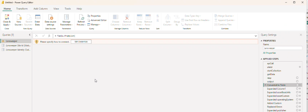 NOTE: The script uses the Lansweeper Data API assetResources query. You need to be familiar with the Lansweeper Data API in order to modify the query and change the fields you want to import into Power BI. Please have also a look at the Lansweeper Data API restrictions.