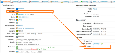 I've added a script below which fills the scanned AD displayname in the Contact field, if the last logged on user was an AD user and this AD user was scanned via an Active Directory User Path target.