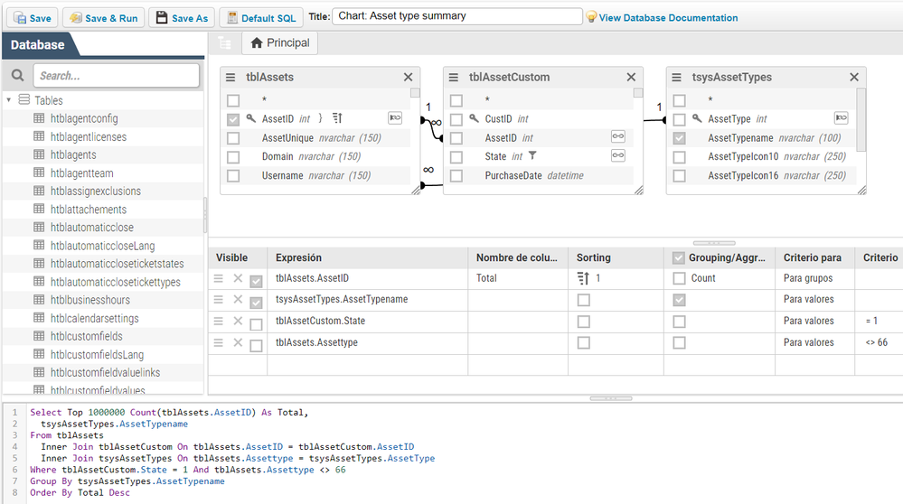 I just wanted to edit the widget mentioned in the title, so that it would only show me Windows device types and Monitors. After doing some research, I found that widgets (charts) are fed by Lansweeper's built-in reports, and I found the one I was looking for, called "Chart: Asset type summary." In it, I simply deactivated the "AssetTypename" field from the "tsysAssetTypes" table. After doing this, the main chart no longer shows the pie chart that used to display normally. However, the legend is still displayed correctly, showing the count of device types.
