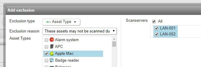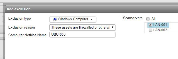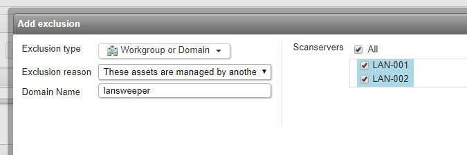 If you have multiple scanning servers, you can choose to add the exclusion to all servers at once. From Lansweeper 7.2 onward, you are forced to submit an exclusion reason when creating an asset exclusion for one or more scanning servers. You can choose one of the predefined reasons from the dropdown or manually type a reason by choosing the Other option.
