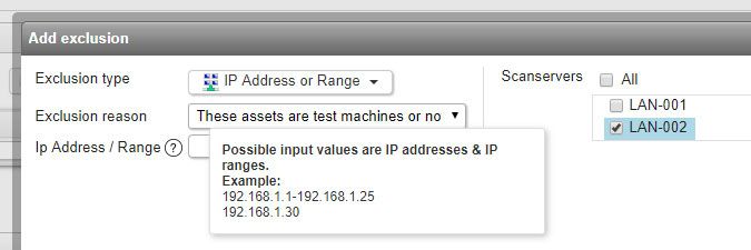 - IP Address or Range: enter an individual IP address or an IP range into the exclusion pop-up window.