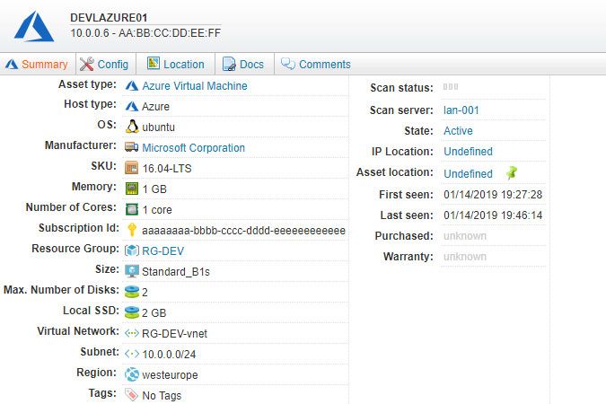 Lansweeper is capable of scanning resource groups and virtual machines hosted on the Microsoft Azure cloud computing platform. An asset is created for each resource group and for each virtual machine. Scanned data includes resource groups, virtual machines and their types, disks, extensions, IDs, network interfaces, regions, security groups, subnets, tags and more.