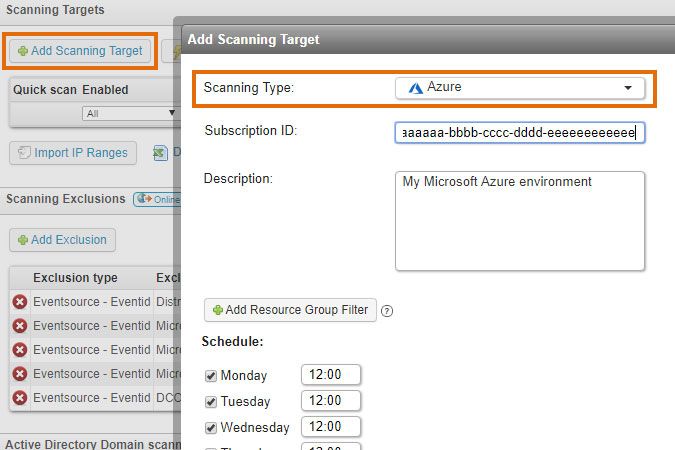 Submit your Azure subscription for scanning by clicking Add Scanning Target in the Scanning > Scanning Targets section of the web console. If you have multiple scanning servers, there will be a separate configuration tab for each server. When submitting your subscription, you will be asked to specify a scanning schedule. You can filter the scanning target so that only specific resource groups are scanned, by submitting the groups with the Add Resource Group Filter button.