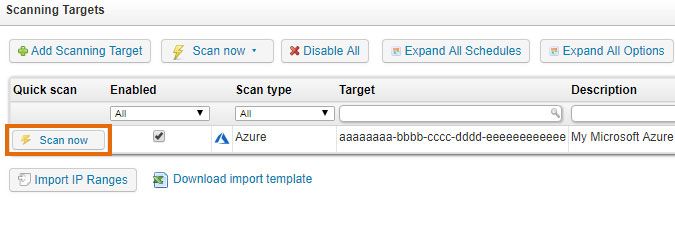 Wait for your scanning schedules to trigger or initiate an immediate scan by clicking Scan now next to the Azure target under Scanning > Scanning Targets. Azure scans do not visually show up in your scanning queue, as they're processed silently in the background.