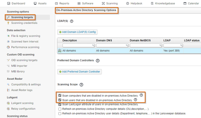 Go to Scanning > Scanning Targets > On-Premises Active Directory Scanning Options. In the Scanning Scope section, enable one or both of the options below, depending on whether you want to scan just disabled computer objects, just disabled user objects or both. Keep in mind that enabling the options below will no longer allow you to enable cleanup options for removing disabled users or computers, and vice versa. The "scan disabled" and "remove disabled" options cannot be combined because they logically contradict each other.