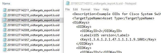 - Click the Export button. The OID targets you've selected are exported in XML format and added to a file ending in .ls.oid. They can now be imported into another Lansweeper installation.