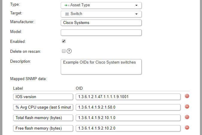 If you leave these fields empty, the OIDs will be scanned for all assets specified as target. If you fill in one or both of these fields, OIDs will only be scanned for the specified manufacturer/model within the target.