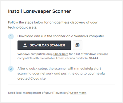 Depending on your situation, you might require a different installation experience. If you're a new customer and do not have a Lansweeper On-prem installation, install the Lansweeper trial. If you're an existing customer with a Lansweeper On-prem installation, link your installation with Lansweeper Sites. If you're an existing customer and want to create a new cloud-managed Lansweeper installation, install Lansweeper Sites. If you're only interested in on-premises installations, install Lansweeper On-prem.