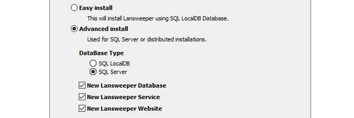 The next dialogue provides the option to choose between an "Easy install" and an "Advanced install". With the Easy install option, a Lansweeper scanning service and a database will be installed. If you selected the Easy install method, you can skip to step 11.