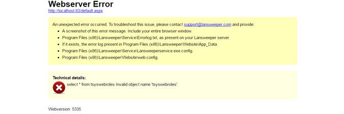 If you update a server hosting the Lansweeper Server service to version 6.0 or install the 6.0 service on a new server and connect it to your database, your database is updated by the service to Lansweeper version 6.0 and the tsysWebRoles table is removed. When this happens, it is important that your web console and any other servers hosting a Lansweeper component are updated to version 6.0 as well. If your web console remains on a 5.x version of Lansweeper, it will continue to look for the now non-existent tsysWebRoles table in the database and will throw the error below.